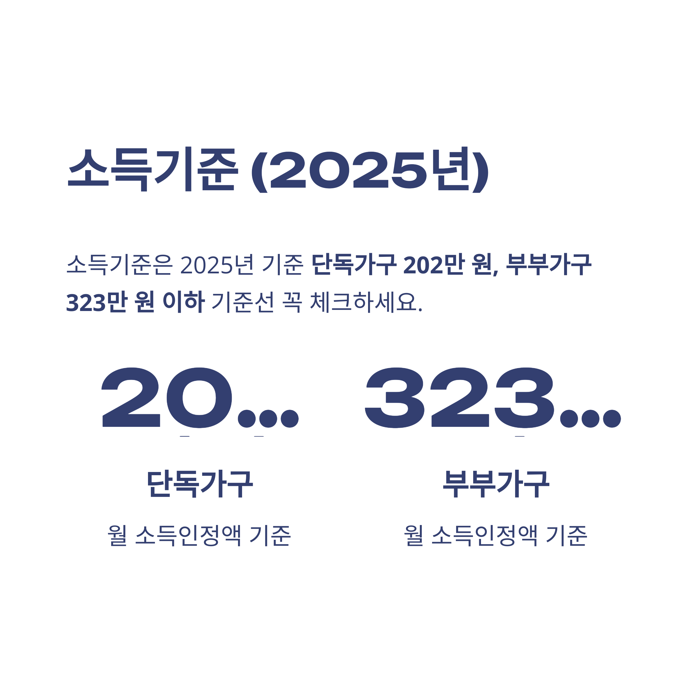 | 소득 기준 | 단독 202만원, 부부 323만원 이하 |