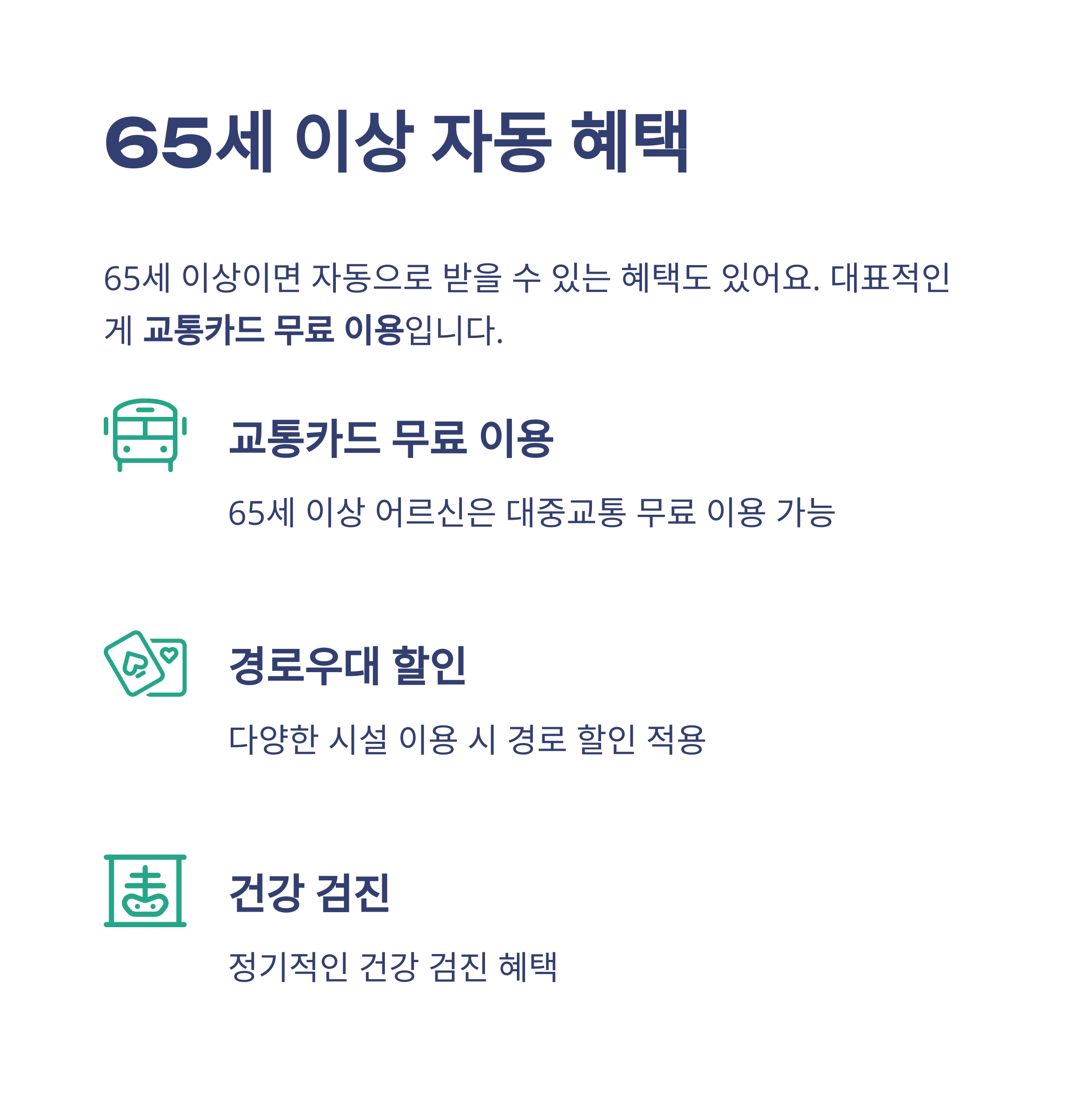 - 지하철: 수도권 기준 65세 이상 무료 (신분증 지참 발급)