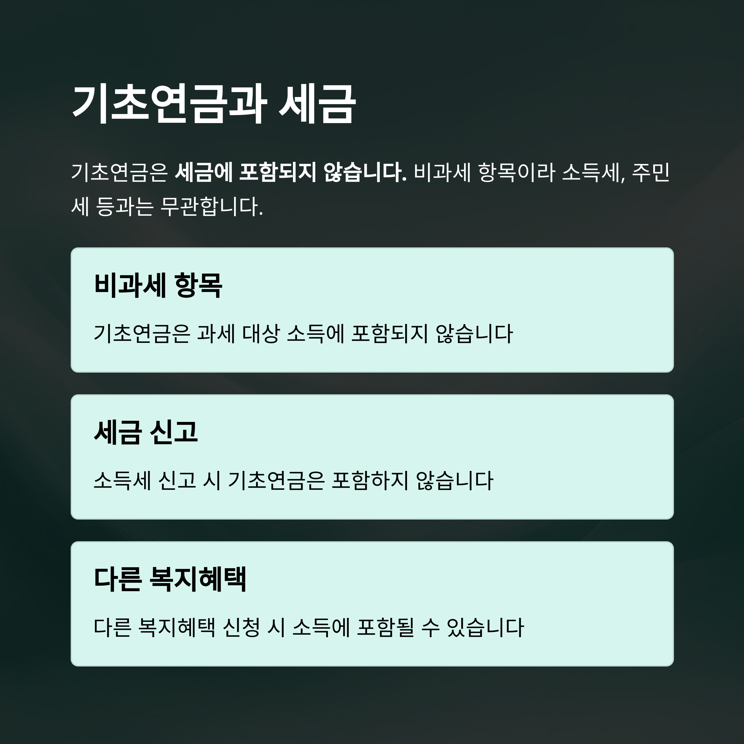 “기초연금 받으면 세금 더 내는 거 아니냐”는 질문을 저희 어머니도 하셨어요. 결론부터 말하면, 기초연금은 비과세 소득입니다. 종합소득세, 건강보험료, 주민세 등 어떤 세금에도 포함되지 않아요. 하지만 복지수급 자격 판단 시 소득인정액 계산에는 포함될 수 있어 유의해야 합니다.