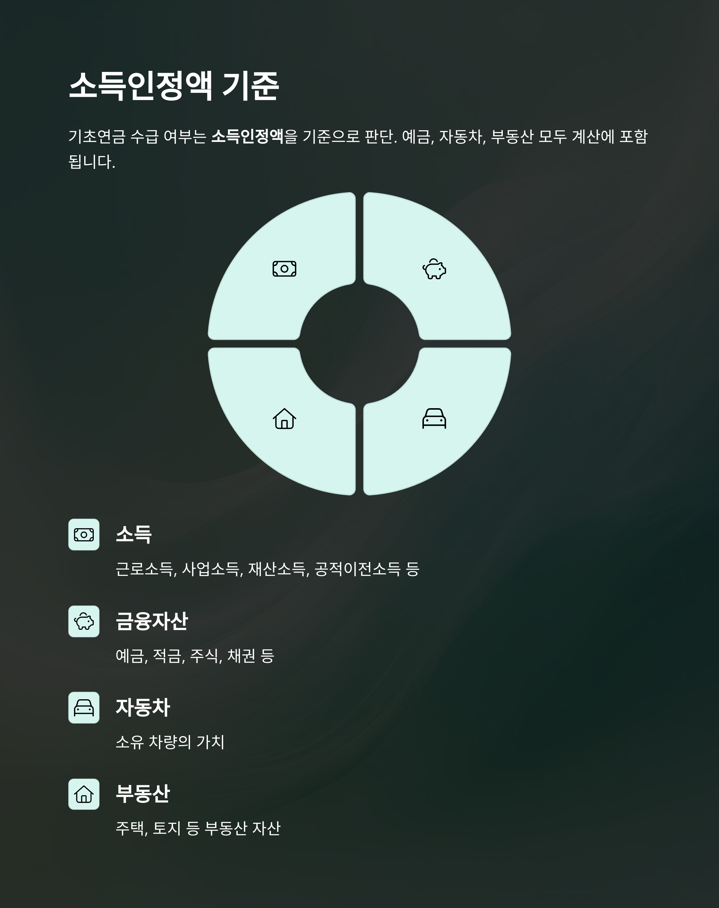 | 지급 조건 | 소득·재산 기준 | 가입 기간, 납입 금액 |