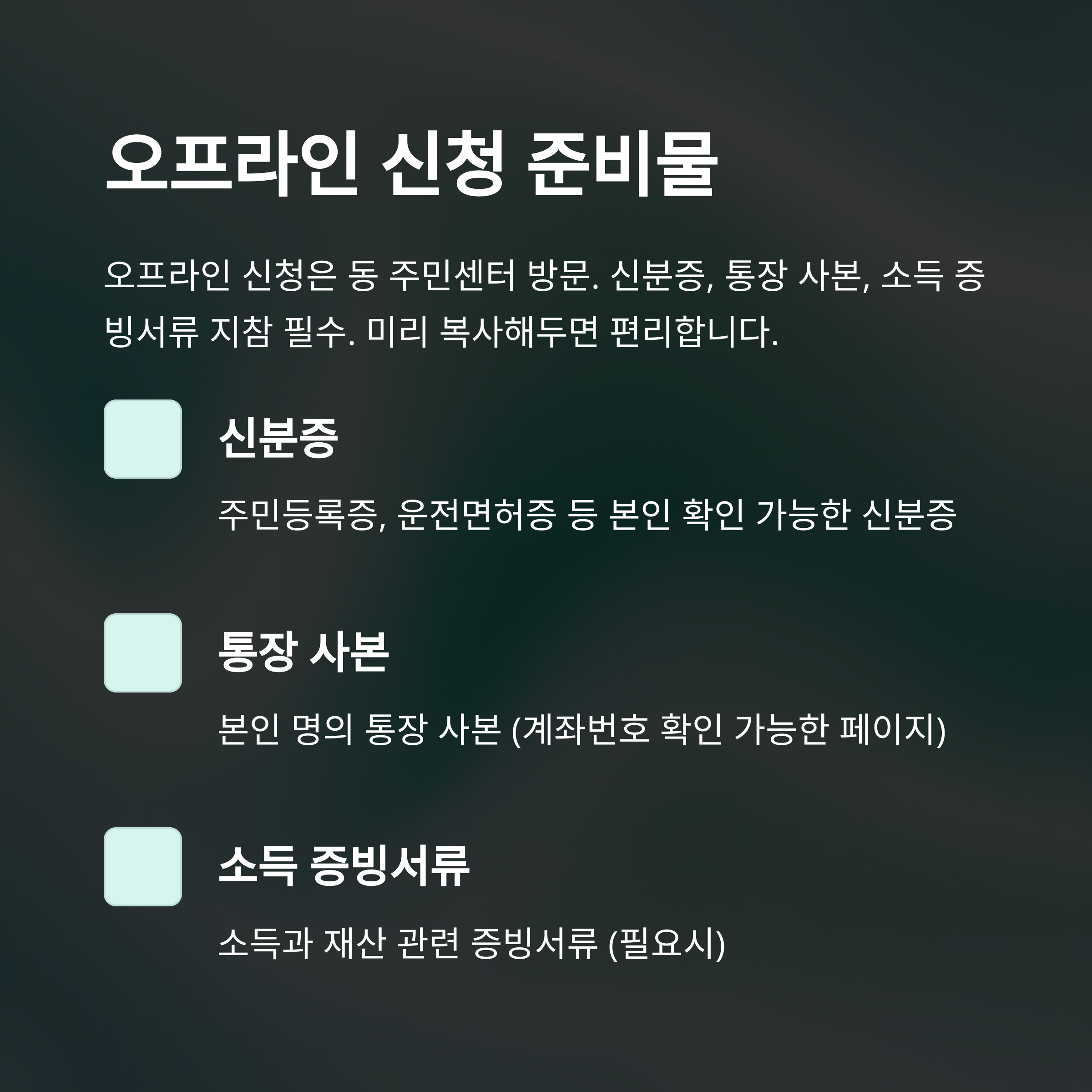 저는 아버지의 경우 직접 동주민센터에 방문해서 오프라인 신청을 했습니다. 생각보다 절차가 간단했지만, 준비물이 완벽하지 않으면 다시 와야 하니 미리 체크하는 게 중요했어요. 주민센터에 방문하실 땐 다음 서류가 꼭 필요합니다.